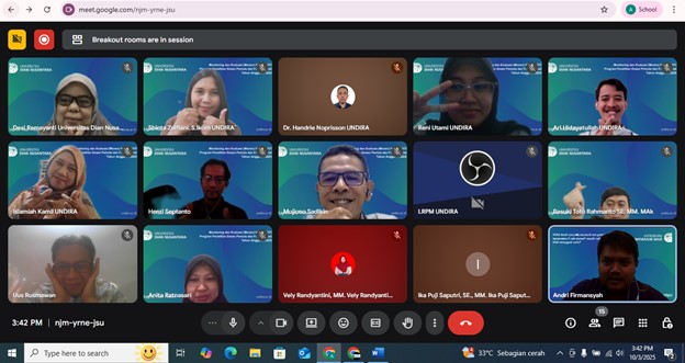 Jakarta, 4 Oktober 2025 – Lembaga Riset dan Pengabdian kepada Masyarakat (LRPM) Universitas Dian Nusantara (UNDIRA) menggelar kegiatan Monitoring dan Evaluasi (Monev) laporan kemajuan program Hibah Penelitian Kemendiktisaintek Tahun 2025 secara daring pada tanggal 2 dan 3 Oktober 2025.